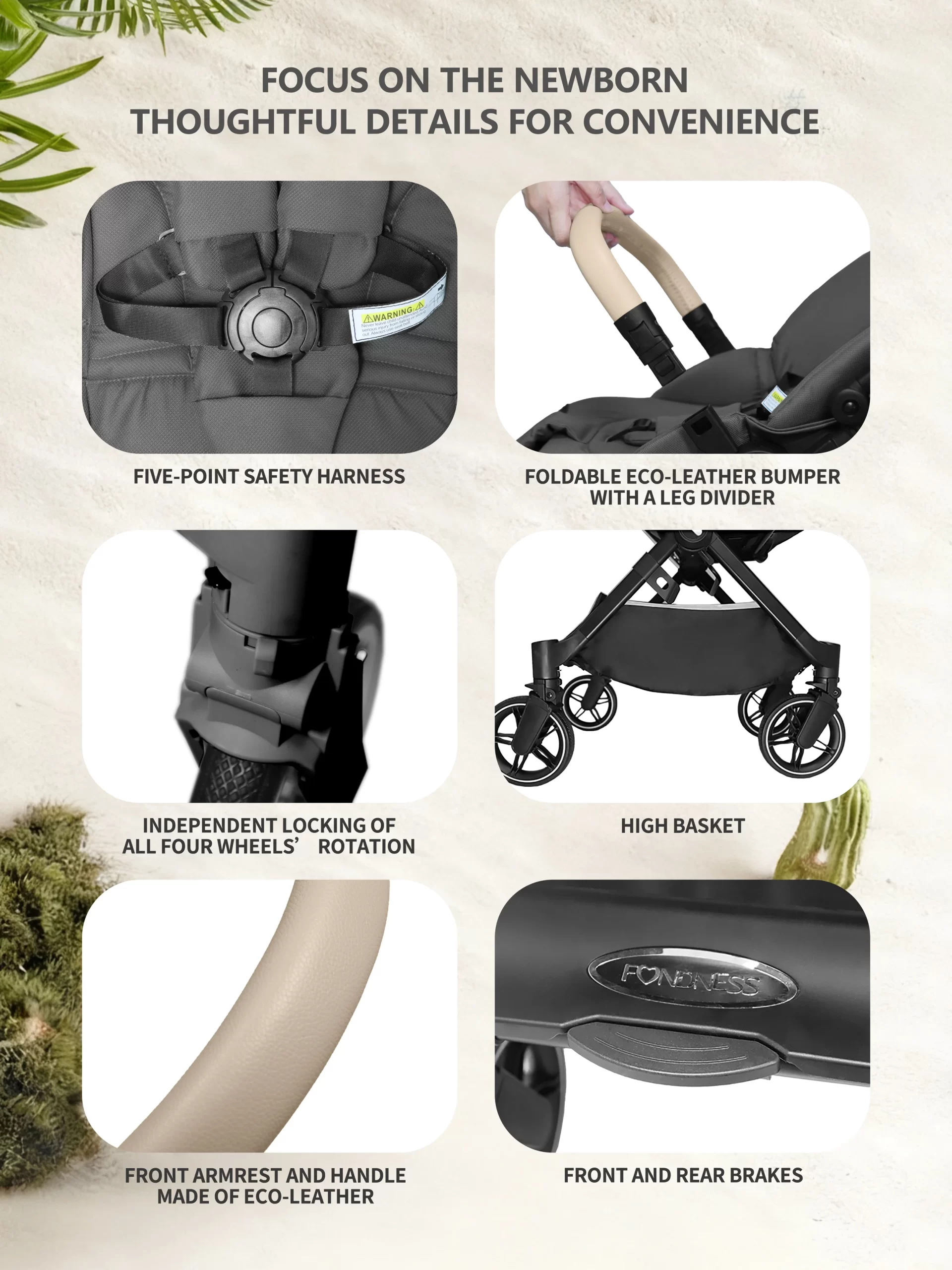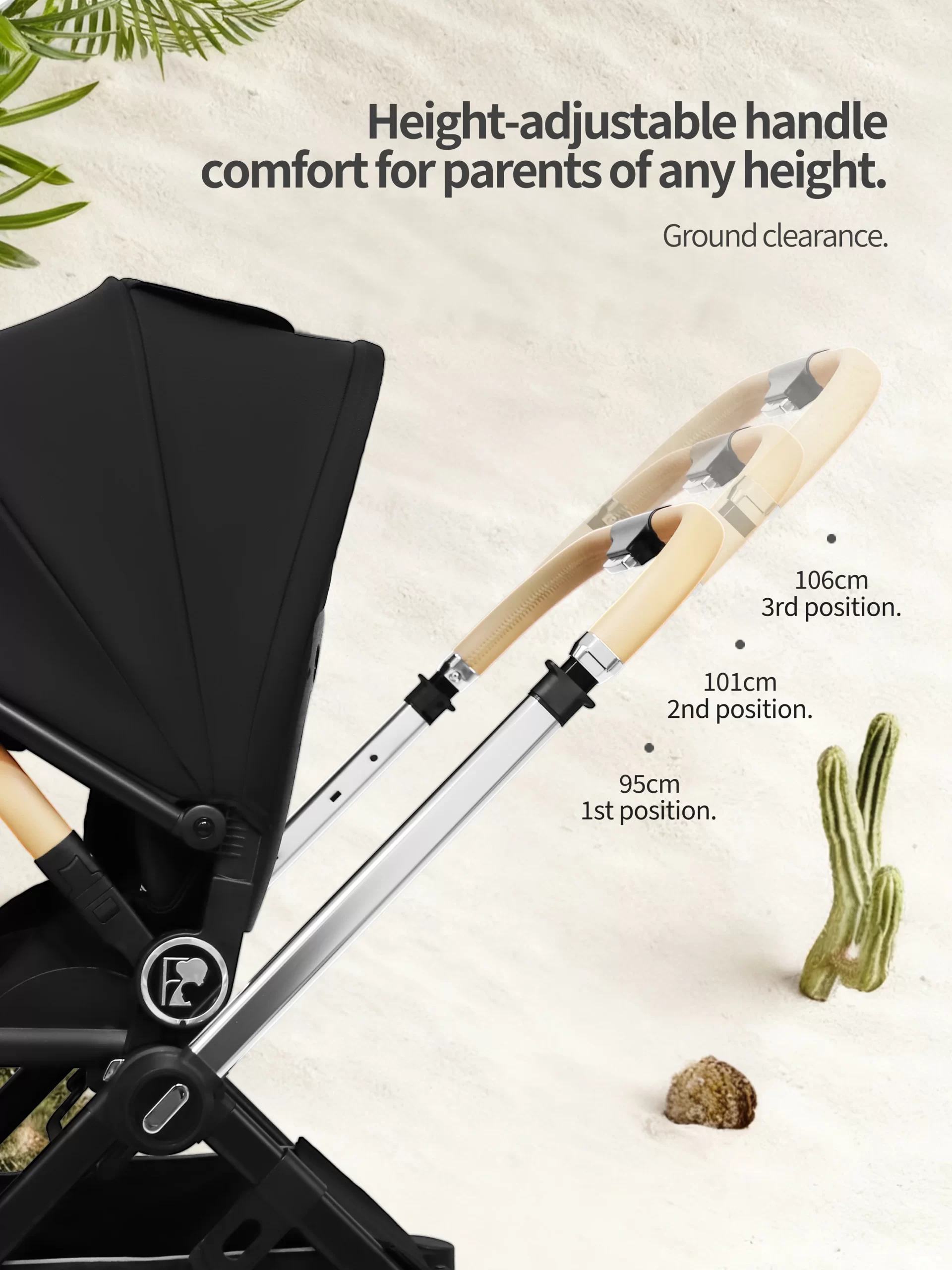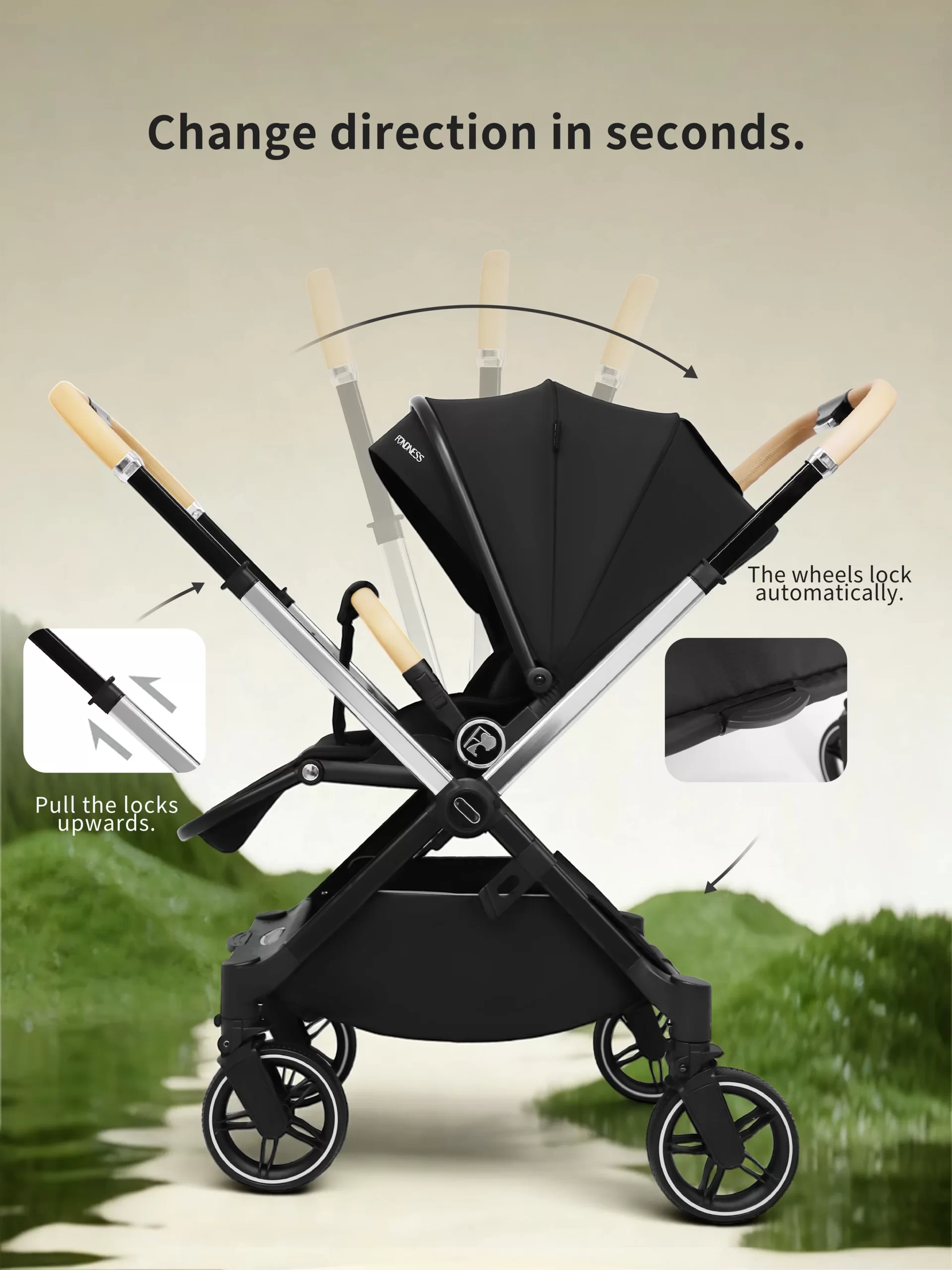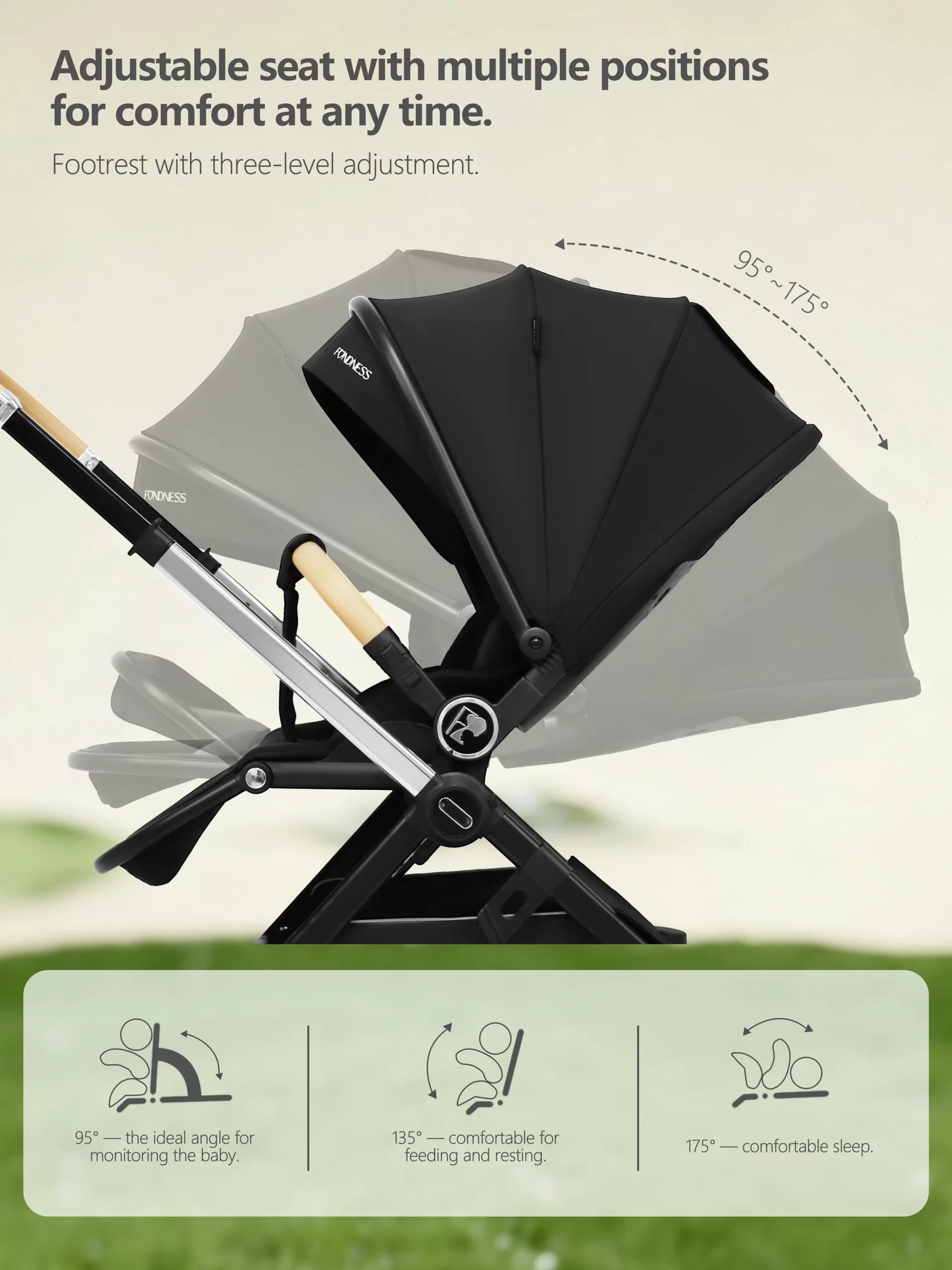 The F900 redefines versatility with its innovative dual reversible system: both the seat and the handlebar can switch directions effortlessly. This allows you to choose between face-to-face interaction or forward-facing exploration while maintaining the most comfortable pushing position. Crafted with a premium anodized aluminum frame and full PU leather accents on the handlebar, armrest, and canopy, it offers style and durability. The telescopic, 3-position adjustable handlebar accommodates caregivers of all heights. With 4-wheel swivel maneuverability and a lie-flat recline, it ensures a smooth ride from infancy. It includes practical accessories for everyday use.