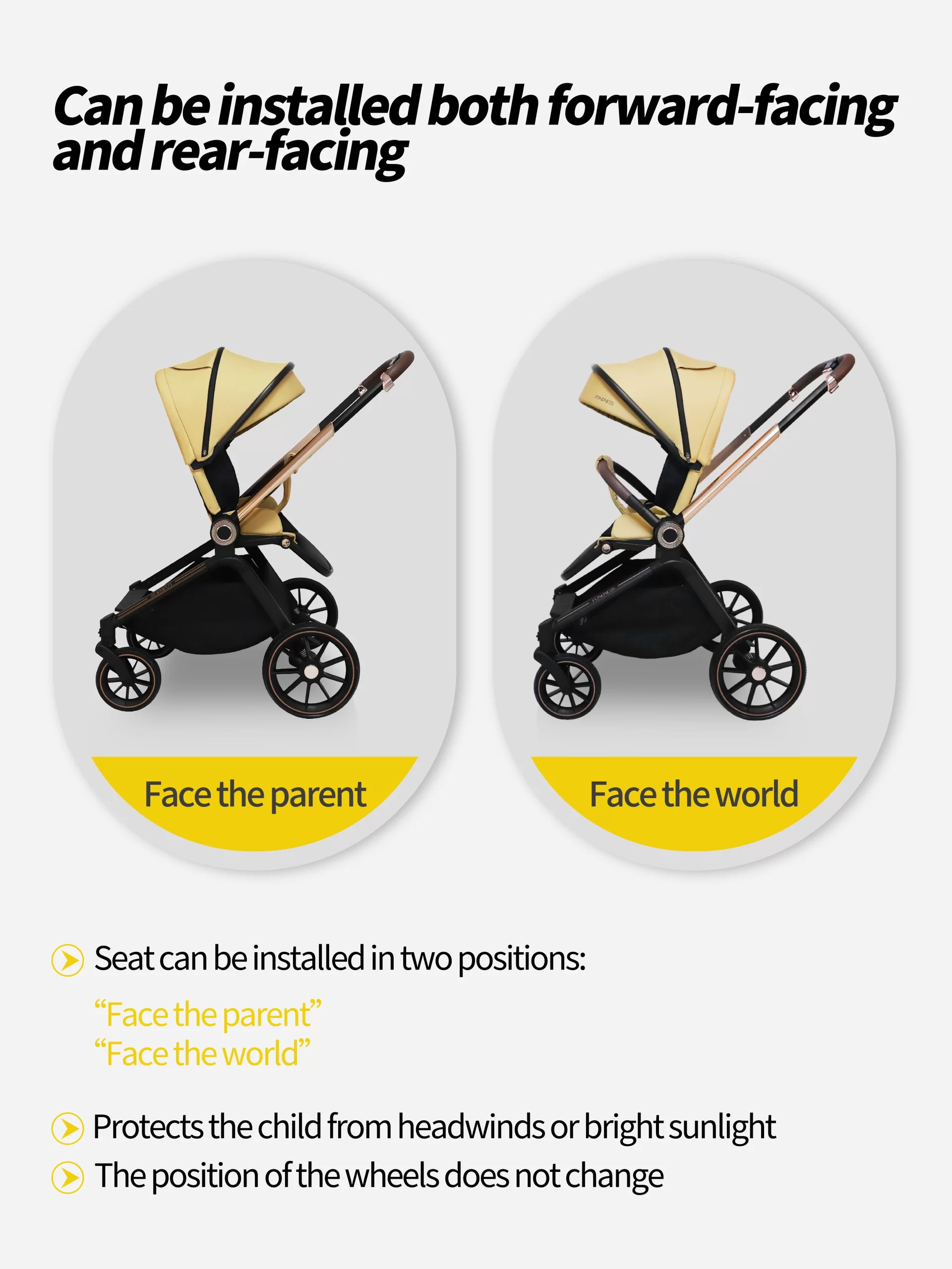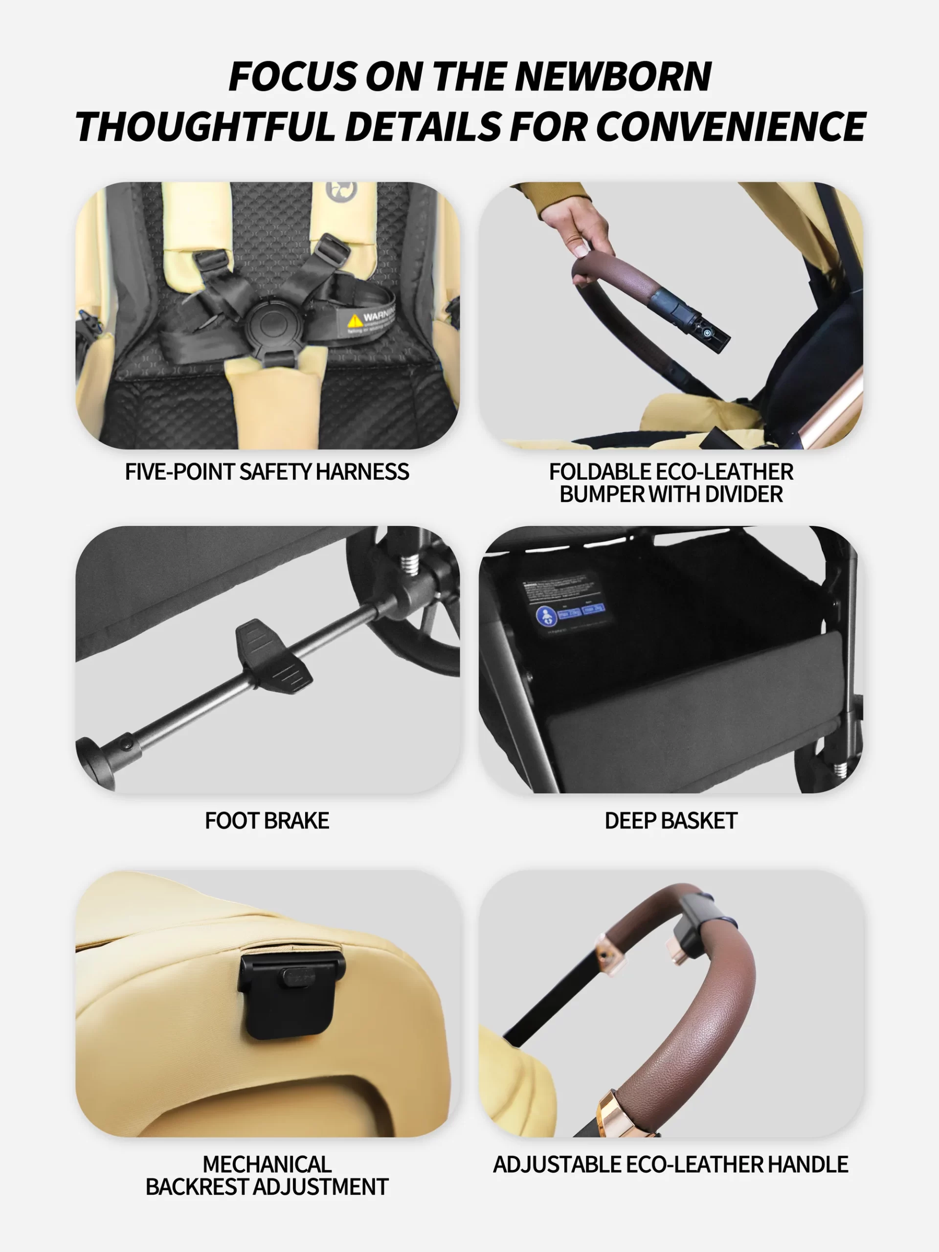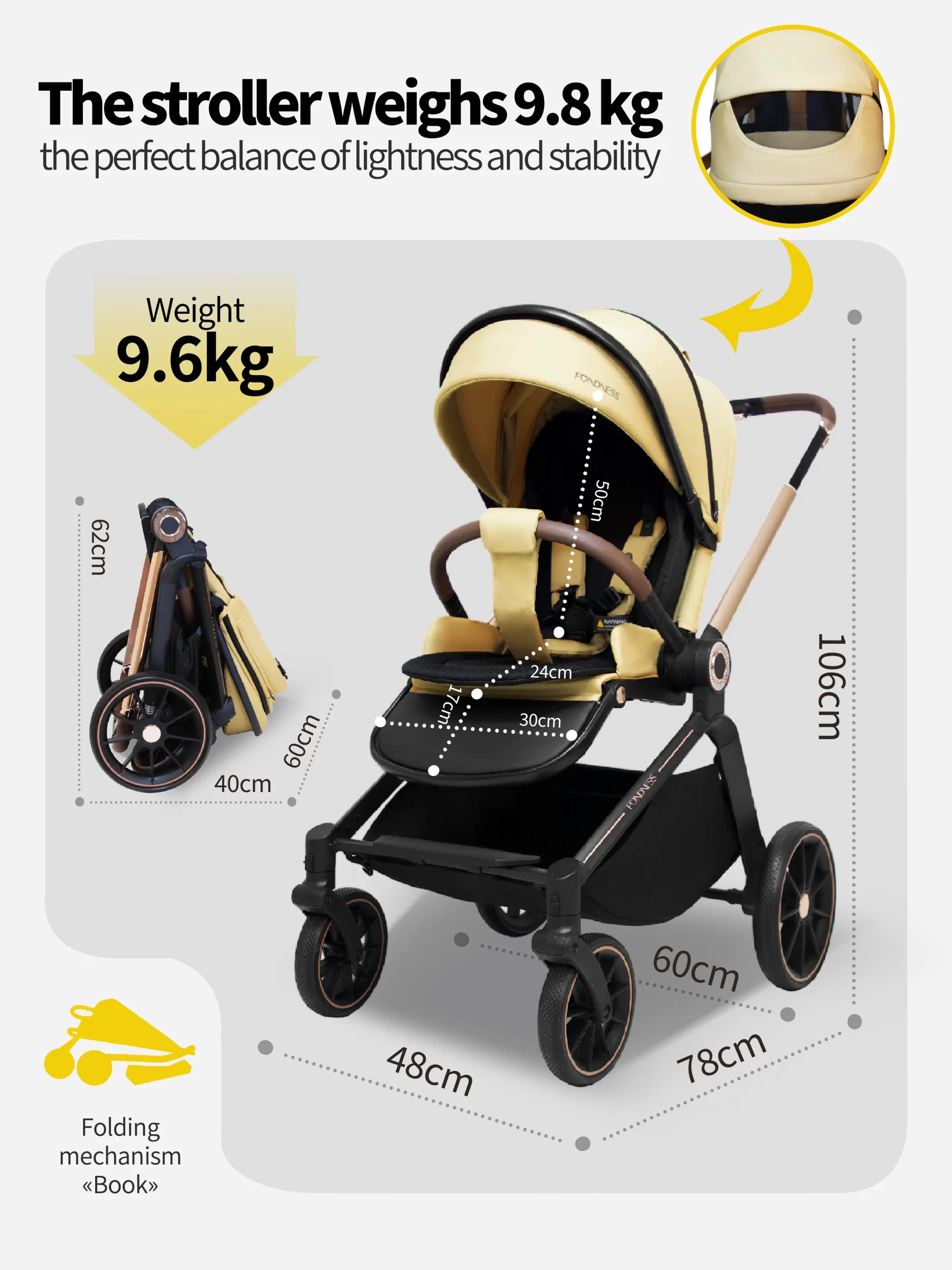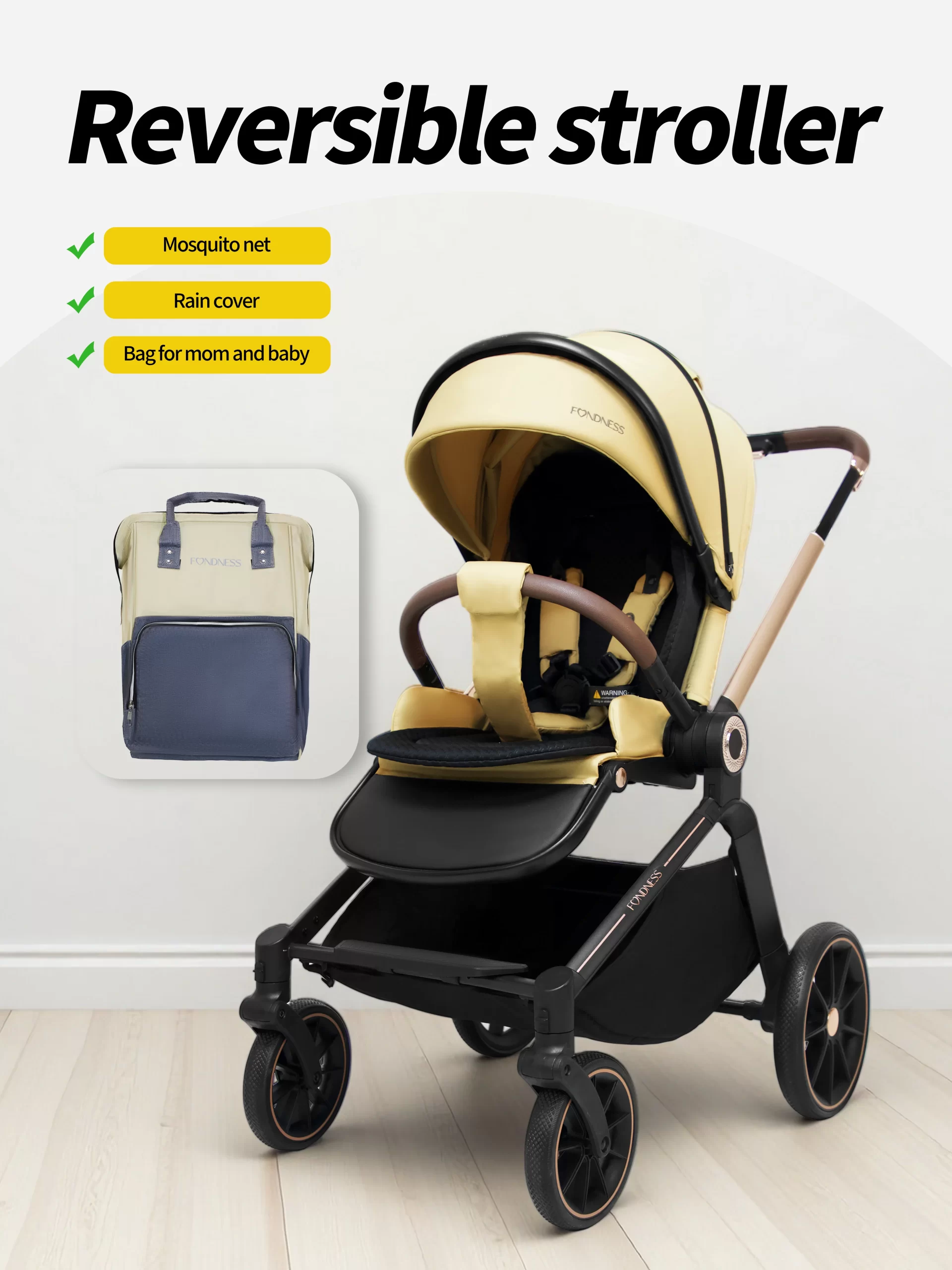 Navigate any path with the versatile FTC007 stroller. Its defining feature is the reversible seat, allowing your child to face you for bonding or the world for exploration. Built on a sturdy aluminum frame, it rides smoothly on 8″ front and 12″ rear foam wheels. The premium leather handlebar and armrests add a touch of luxury, while the one-step dual rear brake ensures safety. It folds compactly to stand on its own and comes with a complete accessory set including a backpack, mosquito net, and rain cover.